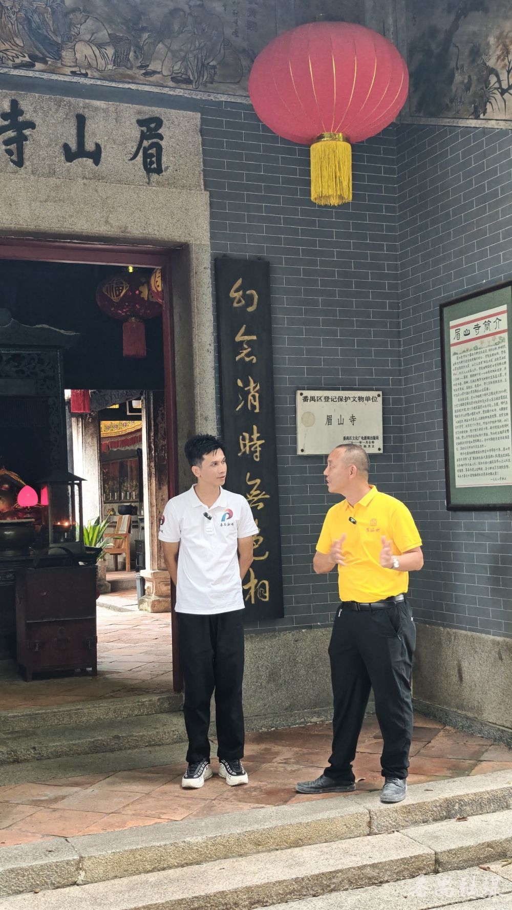 “番禺有一条古村身处闹市却隐藏着一个五百多岁的古寺。他的名字与苏东坡有关......”直播伊始,主持人在村口“奕世书香”牌匾前以一段精彩开场引入主题,随后由黄编村党委书记苏湛英细致讲解了黄编村的由来,黄编村与苏东坡渊源深厚,村民多为其后人,数百年来始终传承着书香文化和重视教育的良好风气。