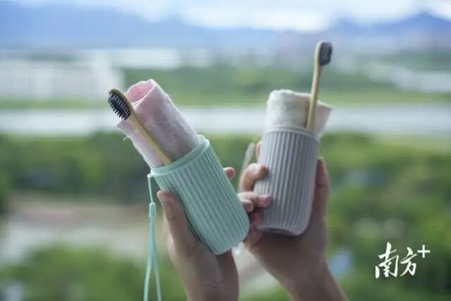 三件套包含竹炭牙刷、竹纤维毛巾和旅行杯。 受访者 供图